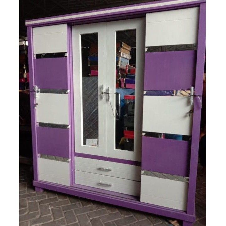 Lemari pakaian 4 pintu minimalis ukuran panjang 183cm tinggi 194cm dan lebar 51.5cm bahan multiplek dengan ketebalan.